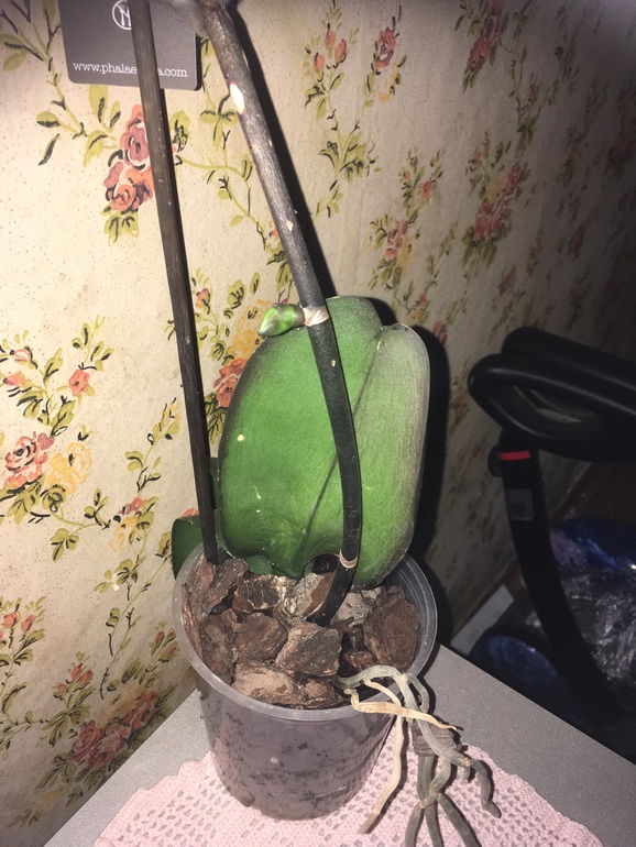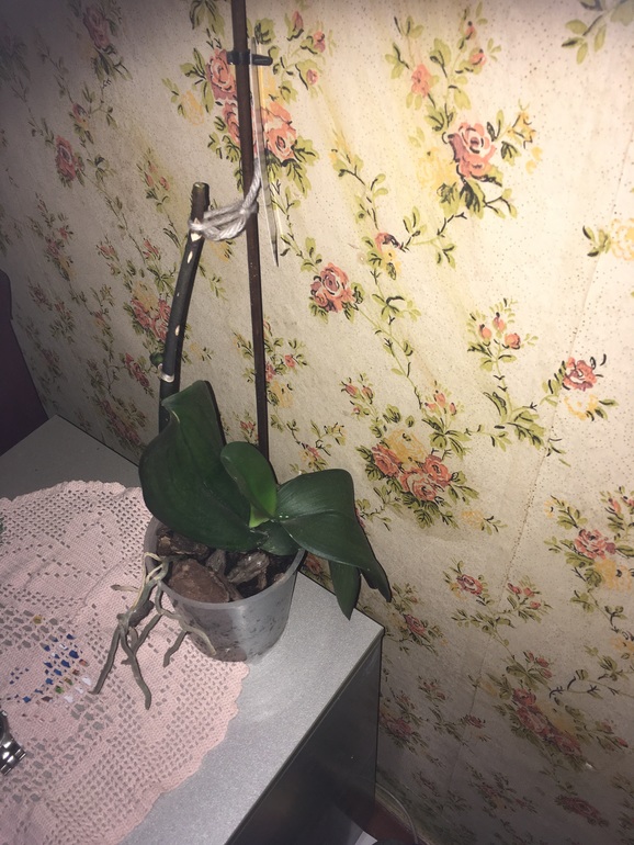 Когда она сбросила в марте цветы, начал желтеть один лист. Я купила кору и пересадила. Корни которые были в горшке были сильно повреждены (сгнившие), их я обрезала и активированным углём присыпала, а верхние были сухими очень. Спустя месяц начал расти новый листик. И буквально недели три назад начало расти вот это. Новые корни сверху не пустила, а внутри горшка виднеется зелененький большой( значит вырос, потому что не было его). Поливаю раз в неделю, но смотрю чтоб конденсата в горшке не было. Стоит она на подоконнике не под прямыми солнечными лучами. Это я ее фоткала и переставила.