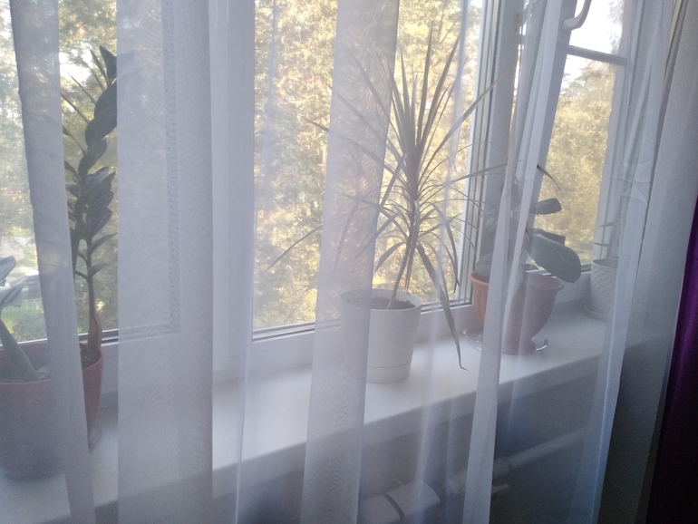 Здесь значит замиакулькас, рассадила часть себе, часть маме, а то бедный заростил весь горшок. Драцена (тоже кривобокая 😁), фикус и ещё одна драцена, другой вид.