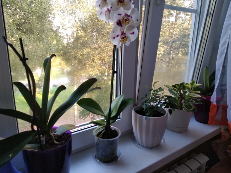 Одна орхидея новенькая, цветет ещё после магазина, две другие пустили цветоносы, тоже жду 😍 одна белая, другая фиолетовая. И педилантус.