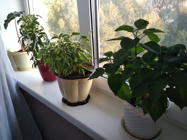 Тут всё по классике. Пуансеттия, фикус Бенджамина, шефлера (кривобокая 😂), и антуриум который пустил ещё один листик).