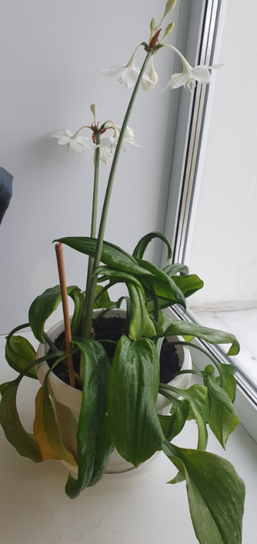 Я бы актарой обработала от букашек и под пакет. Раза 2-3 так, а потом через какое-то время полила цирконом. Цветок - это эухарис. У него сами по себе листья тяжелые и пологие. Если в них есть тугор, то паниковать не надо. У меня эухарис с кольцом для листьев стоит, чтобы они не разваливались. И еще, я б срезала сейчас цветы. Растению и так от букашек достается, а если еще и обработать от них, то надо помочь ему восстановиться. Кстати эухарис не любит сильную влажность, аккуратно надо с поливом