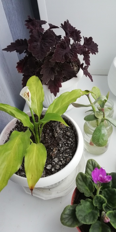 Спатифиллум свекор привёз. Что-то тоже ему не очень хорошо, видимо, но цветок все же пустил и расцвел.