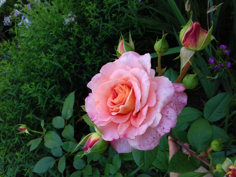 Несмотря на то, что нижние лепестки побиты вчерашним ливневым дождём, сегодня О`Хеппи Дэй прекрасна, а как она благоухает! Если бы я могла передать аромат розы на последнем фото, как она сегодня изменилась - раскрыла свои тонкие лепестки и благоухает, аромат пока не могу описать - это сладкий нектар, медовый с горчинкой, возможно даже липовый мёд))) Очень она меня удивила, в описании сорта аромат характеризуется легким, а тут такое разнообразие оттенков!