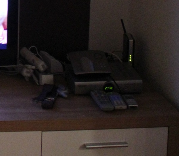 Там телефон + шнуры от него, фигня какая-то от тарелки, чтоб телек смотреть + шнуры + пульт, 2 бокса для интернета и телефона и конечно + шнуры, приставка к телеку (Wii) + шнуры + пульты + зарядное устройство...так чё там ещё? А трубки телефонные и пульт от телека и иногда там зависает мой мобильник. Я в шоке, чего там только нету. Корзинка туда напрашивается для пультов.