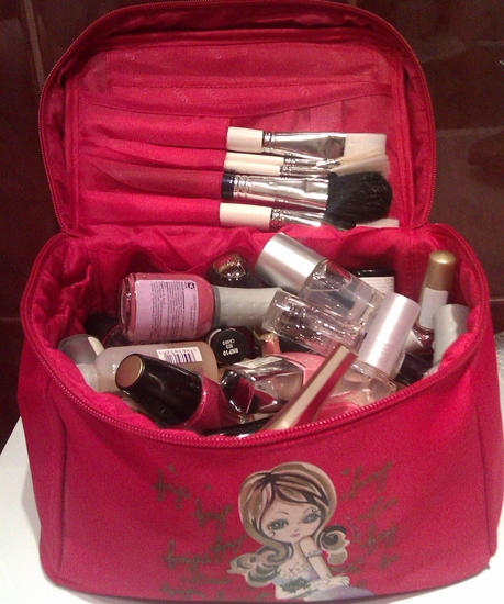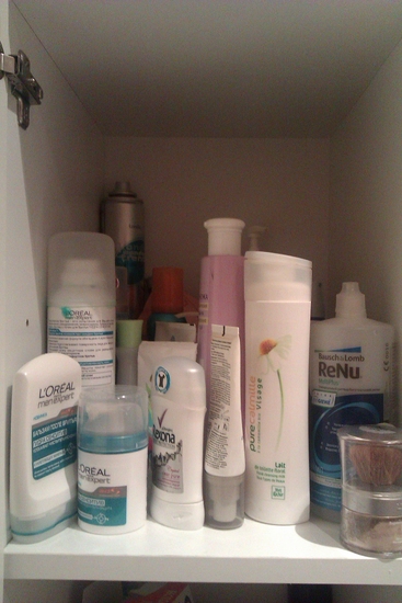 Лаки в косметичке в комнате (в ящике стенки0 стоят, а всё остальное в ванной в шкафчике.