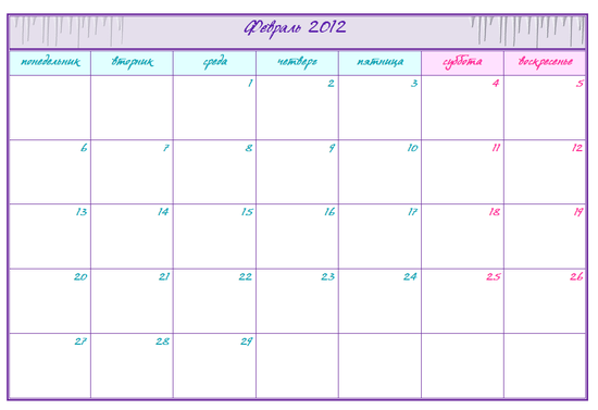 Календарь семейный есть, сделала в ворде на каждый месяц. Вот пример февраля: