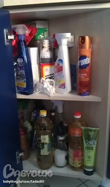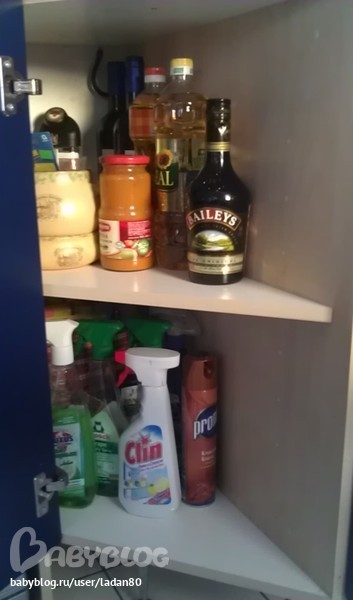 Поделила только на логичные кучки: ту, что на каждый день (я еду в холодильник в контейнерах убираю)-в самую близкую полку, изредка-на полку повыше, а ту, что для поездок (бутылочка, бутербродница и т.д.) в дальний угол полки.