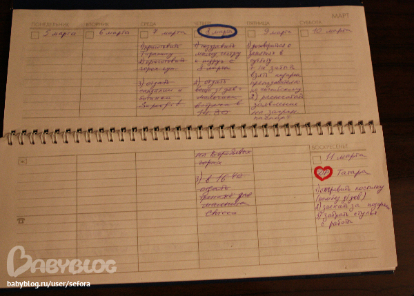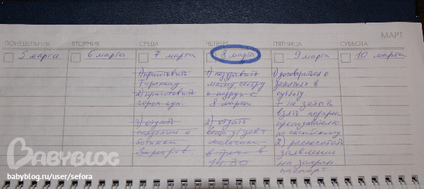 Завела семейный календарь, пока заполняю планинг, мне так удобнее, т.к. там больше места, чем в обычном настенном календаре. Может что-то более интересное придумаю, перенесу туда всю информацию. Сейчас записываю туда дни рождения, запланированные дела и встречи. Все остальное в КЖ.