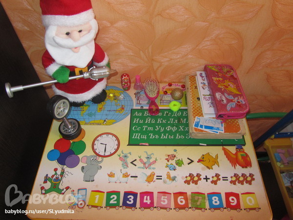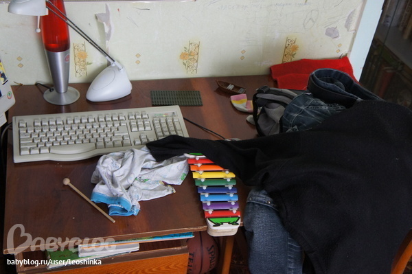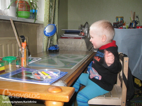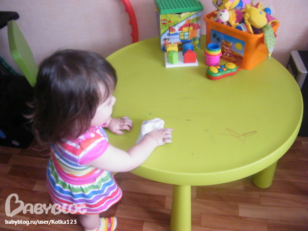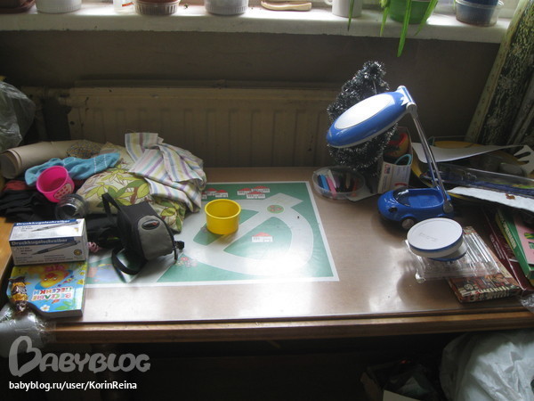 Сразу оговорюсь - полноценно самостоятельную уборку у себя на столе Никита еще не в состоянии провести. Поэтому он сидел рядом и мы вместе решали что надо, а что нет. Мусор он честно сам выбрасывал. Потом я расспросила его, что и где будет ему удобней и под его руководством все разложила. А вот протер от пятен стол он сам))
