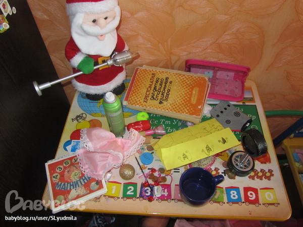 Давайте разделим стол на две половинки: левую и правую. Не надо хвататься за пилу, столик мы делим мысленно! То есть понарошку))) Итак, ставим таймер на 2 минуты и принимаемся за правую половину. Учебники, тетрадки, альбомы складываем аккуратно стопочкой; карандаши, ручки, фломастеры, линейки собираем в стаканчик или пенал; все лишние бумажки и другой мусор в урну! Успеете?