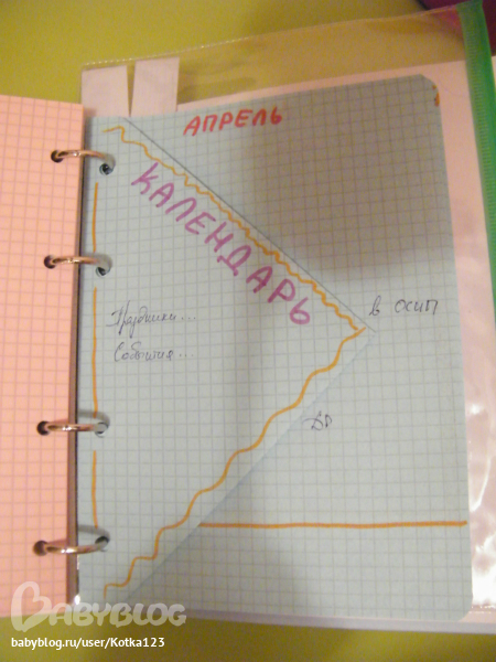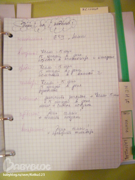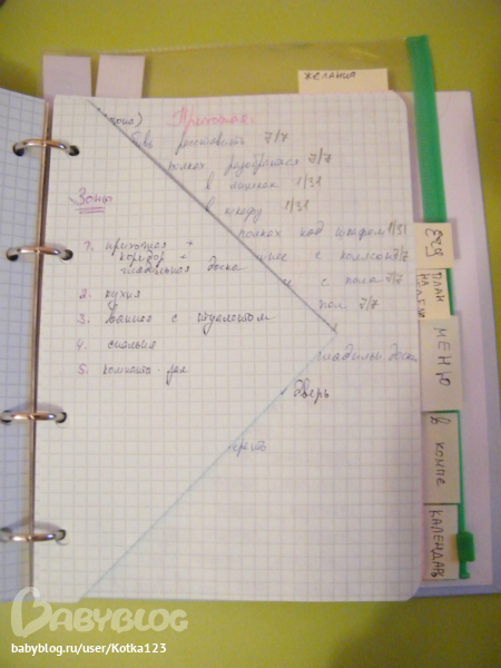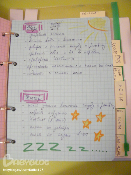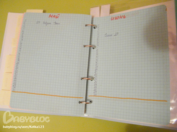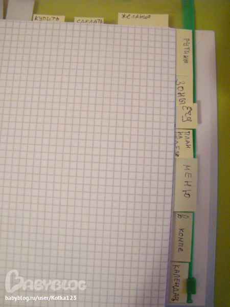 Самые первые листики положила для всяких "на чем бы записать быстренько и не потерять потом" и пишу туда план на день, еще тут видно мои самодельные разделители)))))