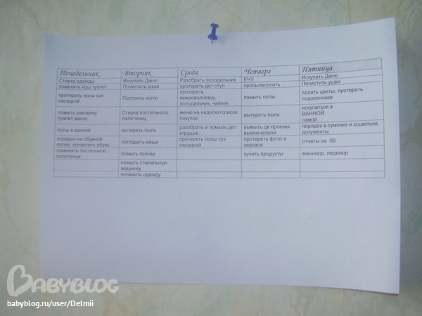 Итак мой базовый план (но это в идеале))) Мне так удобно будет распечатывать и зачеркивать сделанное ежедневно.Там все в табличке одной и легко задания переносить в случае изменений. поправки и комментарии приветствуются. Если пятница у меня "выходной" то выполнять ли задание Келли?