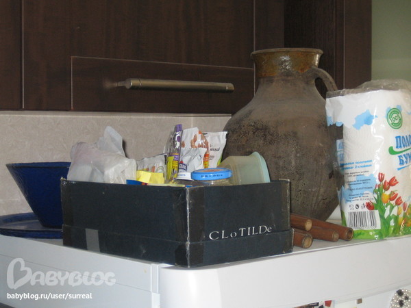 На ходильнике уже давненько стояли спрятанные от малыша, бум. полтенца, страшненькая коробка со специями (надо что-то придумать, а то на фото просто ужас), бамбуковая музыка ветра (поломанная ребенком же), глиняный кувшин, найденный на чердаке в домике в деревне.
