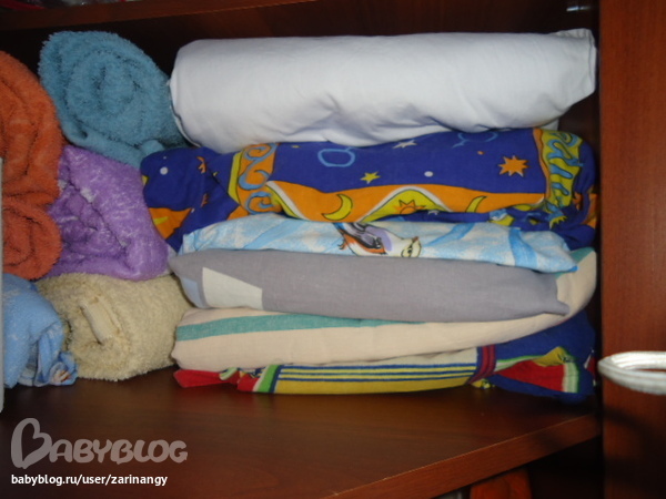 Постельные комплекты. Их немного у меня. Но гостевые есть, они лежат в доп. спальне. Сложила по совету от КОСМО каждый комплект в наволочку. Теряться не будут) Заодно полотенчики скрутила в рулоны. Понравилась эта идея, спасибо, Свет. И, правда, пушистее становятся)
