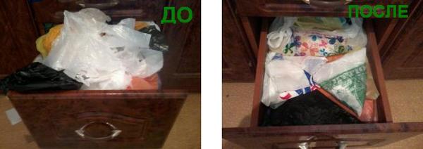 Если заинтересовало, складывала вот по этому примеру. Кстати, Света, я украла у тебя идею рассортировки, и теперь у меня отдельно лежат ненужные пакеты, которые я буду использовать под мусор, а остальные сложены треугольничками и их можно брать, не глядя. Они все хорошие. Кстати, думаю, это один из способов экономии. Раньше они лежали кучищей , и мне проще было купить в магазине новый пакет, чем выбирать из того, что у меня есть. А теперь все удобно сложено, и я не буду их покупать.