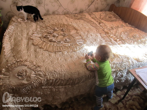 Обои у нас белые, это от штор такой цвет получился))) Малыш пытается телефоном в кису бросить)))