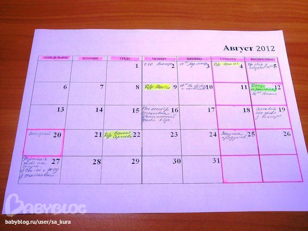 Наш семейный календарь я набивала в Ворде и выглядит он так: