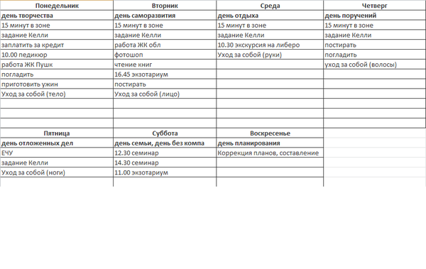 1. Недельный план. Как-то так получается, что начало недели у меня перегружено, а потом больше свободного времени.
