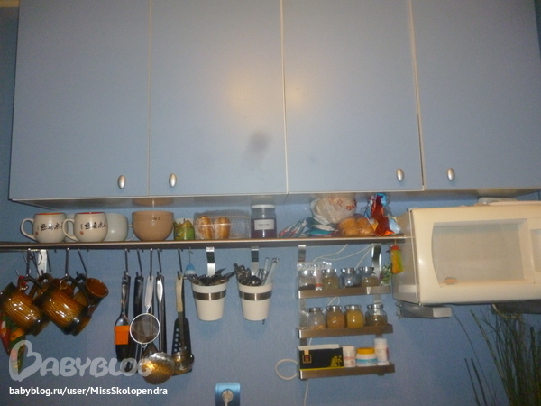 По хранению: у меня кухня очень маленькая, 5,5 кв м, поэтому места катастрофически не хватает. Навесные шкафчики у меня прям до потолка, конечно, не очень удобно лазить на самый верх, но я разместила предметы по мере необходимости, самое нужное - пониже. По шкафчиками у меня навесная полка икеевская из железных трубок. Я в восторге от нее! Можно повесить крючки для половников всяких, полочка для специй на крючках у меня на ней тоже висит, кроме того сверху тоже можно что-то наложить. У меня там кружки для чая, пиалы, хлеб, кексы и т. д.