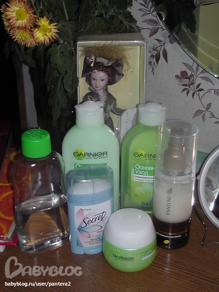 Маслице "Джонсон с бэби", Гарньер тоник и молочко для снятия макияжа, увлажняющий крем для лица, и укрепляющее средство для волос. И этим, бывает, забываю пользоваться((