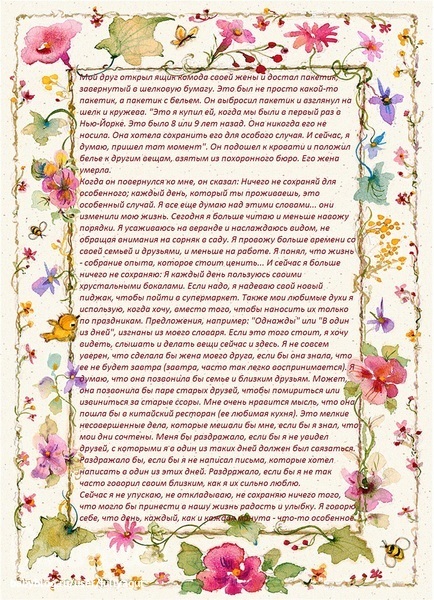 Это висит у меня на холодильнике, скачала с флайледи.ру ...для мужа, чтоб жил настоящим, но и для себя вынесла кое-что- нет у меня трусов на особый случай - все ношу сейчас.