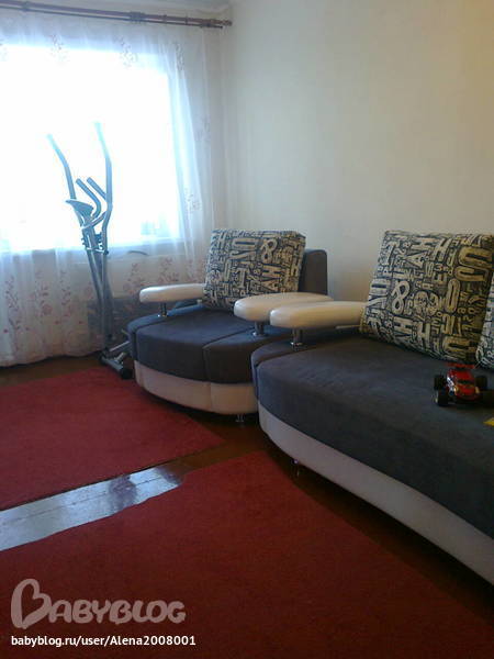 Гостиная. На диване, креслах и, конечно же, тренажере, теперь не скапливается одежда. На полу лежит старое ковровое покрытие, которое должно уже лежать на балконе, но так как я не могу добраться до магазина, чтобы приобрести новое, то пока оно греет нам ноги))) И опять - нет штор, потому что хочу новые)))