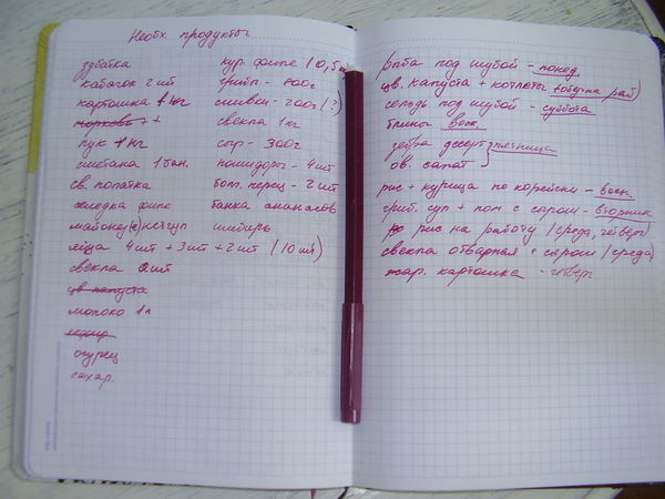 Меню составляю в любой момент, когда еду в метро, когда кормила сына грудью, когда перерыв 10 минут. Главное записать. Это старое фото, но смысл понятет. пишу обычно быстро, поэтому такой почерк. На выходные лучше перезаложиться, муж может съесть очень много, как показала практика.