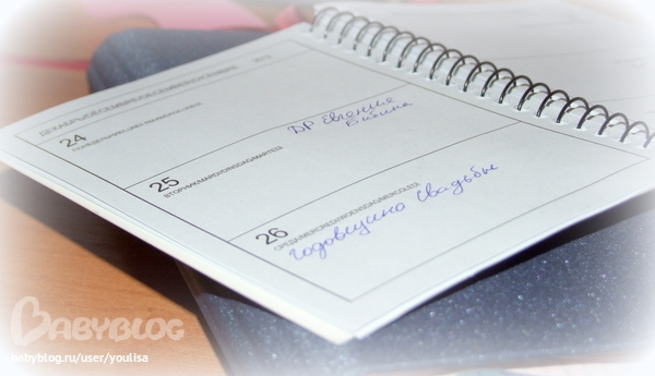 Очень вовремя мне в руки попал простенький ежедневник, его то я и решила использовать в качестве семейного календаря, внесла туда даты, какие на вскидку вспомнила, буду стараться вносить текущие. И главное не забывать его просматривать и использовать. Конечно, в идеале мечтаю сделать большущий календарь, с разными пометками, но сейчас домашние не поймут этого.
