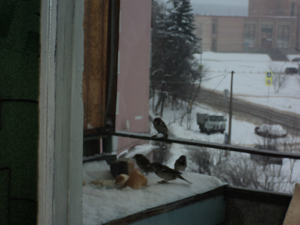 и наши птички-синички за окном!! надо подготовить им кормушку))) а то пока растаскивают хлеб по всему балкону((( но дочка в восторге! рада им!!! а как чирикают по утрам!!