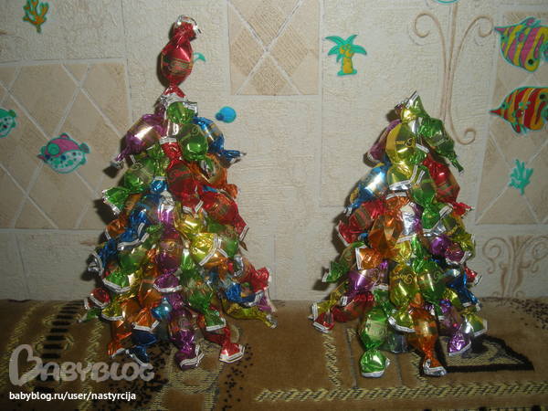 Отчитываемся по заданиямБыстро пишу,ато инет отключаеться.Сделала две елочки,одну мужу на работу,пусть с кофе точит кети,ну и сотрудники пусть пасуться ))))) а малый как увидел, кричит и мне такую сделай,так-что родилась сестричка елочка, поменьше!!! На картоный конус наклеила фольгу,потом полосками двустороний скотч,а на него канфетки!!!