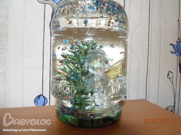 Воду брала обычную, добавила 25 г глицерина. Фигурки приклеила к крышке клеем Момент для обуви. Крышку проклеила полимерным клеем, чтобы вода не вытекала. Роль "снега" играют самые маленькие пайетки двух разных цветов. Хотела серебристые, но не нашла. Не обратила внимания на рисунок на банке внизу. Из-за него не очень видно фигурку, но это не сильно криминально. Поделка обошлась: глицерин - 6 р., фигурка ангела - 20 р., пайетки - 20 р. Итого: 46 р.) Ёлочку "отпилила" от обычной искусственной домашней ёлки)