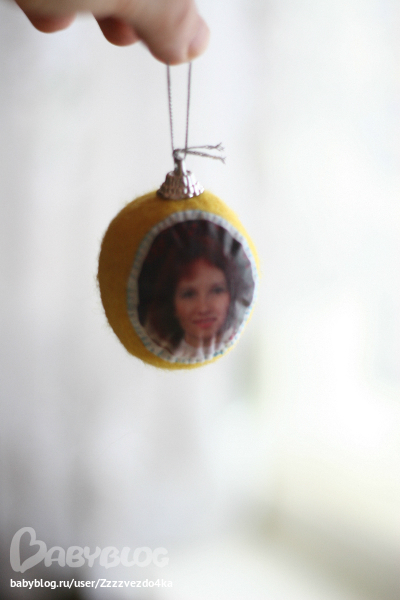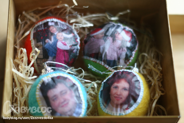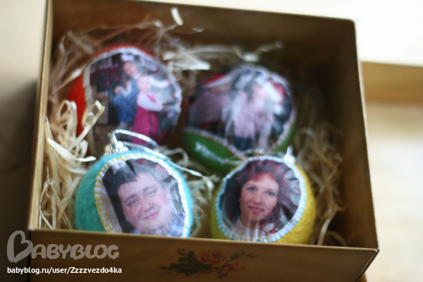 День следующий - шарики))) Я сваляля шарики уже в начале декабря, но все не знала, как их оформить. А тут мне в голову пришла бредовая мысль о шариках с фото, покумекала и решила перенести фото на фетр и пришить его, получилось, конечно, косячно, шарики маленькие, а фото хотелось чтобы было читаемое)))) В след году учту все свои ошибки и сделаю шарики крутяцкие))))