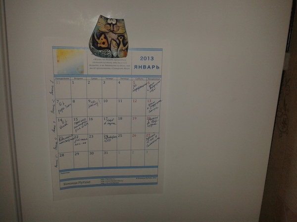 Сегодняшнее задание - полюбить себя. С этим у меня нет никаких проблем. В себялюбие ежедневно входит утренний стакан воды натощак, завтрак с обязательным сладким блюдом, время на себя - чтение, вязание, подработки в интернете, тренировки с Джиллиан Майклз... и много-много другого))) С началом взлета я сделала для себя еще одно доброе дело - привыкла ложиться в кроватку не позже полуночи при любом раскладе, единственным исключением стал Новый год. Сил прибавилось втрое!! Режим вообще великое дело, жаль, что я поняла это так поздно :) И как обещала, должок - фото семейного календаря (убираю под кат, т.к. знаю, что многие сидят с телефона-планшета, не хочу засирать им ленту)