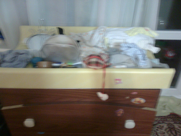 например пеленалка. К сожелению фото совсем плохое. но смысл понятен. Завалила совсем пеленалку. надо было ее уже давно убрать. но я боялась что на ее месте получится свалка. а оказалось что мне ничего не помешает сделать эту свалку прямо на пеленалке.
