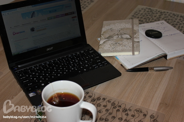 После кашки ( да, мы все едим молочные каши на завтрак, даже муж), крепкий чаек , просмотр рабочего ежедневника, сверху лежит Флай-блокнотик)))). Ну и ББ на закуску.