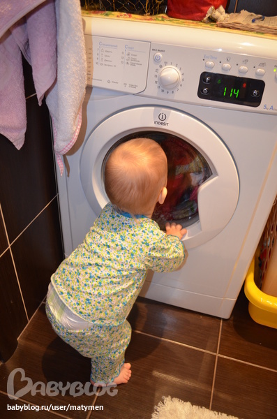Переодеваю Веронику и запускаю стиралку с детскими вещами. Гномику в пижаме очень нравится процесс стирки.