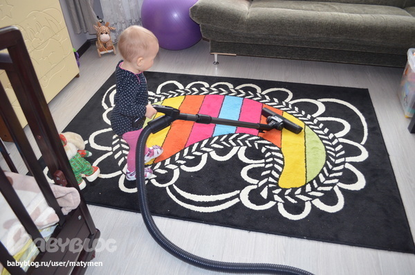 После еды я стараюсь не лежать и не сидеть, а заняться чем-нибудь полезным, поэтому мы продолжили ЕЧУ. Осталось пропылесосить и помыть пол. Пылесошу я каждый день, это у меня 5-минутное спасение комнаты, а все из-за вот этого коврика, на котором любая крошечка словно бельмо на глазу. Но у меня есть кому мне помочь)))