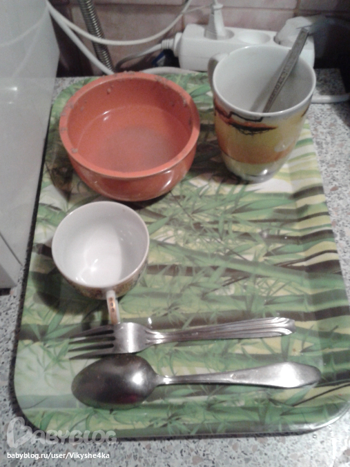 У меня с интернетом на компе (сейчас с телефона) проблема поэтому с фото пока не получается показать поднос. муж уже оценил. раньше на стол ставил и уходил, из за чего вся посуда была по всей кухне( и в раковине и на столе и на кух. стенке), сейчас после завтрака ставит в поднос.