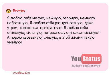 Прочитав статьи о любви к себе, я очень прониклась, воодушевилась! Стала относится к себе гораздо лучше,противные голоса присекаются на месте.хвалю себя постоянно.