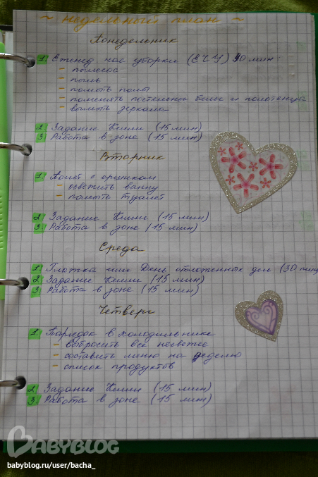С понедельником все понятно. Вторник. Сюда я влепила уборку в ванной и туалете. Многие девочки умудряются проходиться ершиком по туалету с утра и мыть раковину в ванной во время вечернего туалета. Я так не могу. Да и муж пойдет следом чистить зубы и все загадит Поэтому во вторник я вымываю ванну и туалет, стираю коврики, провожу ревизию по моющим-чистящим средствам. А в течении недели, когда мелкую купаю, прохожусь по верхам. Среда. Если нет глажки, то я приступаю к тем делам, которые все время откладываю. Сначала это был детский фотоальбом, сейчас это моя книга рецептов. Все никак не могу собрать в кучу свою рецепты. Потом это будут цветы. Мечтаю дома устроить ботанический сад. Куплю книгу и буду учиться ухаживать за домашними растениями. Четверг. Это мой любимый день!!! Обожаю лазить по холодильнику, писать список продуктов и составлять меню!