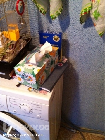 Рядом с клеткой попугая на стир. машинке.