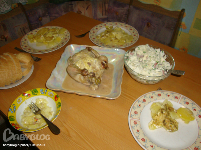 ужин - тоже без понтов, курица в рукаве, картофель в сметане ( в духовке) и салат из капусты с клюквой
