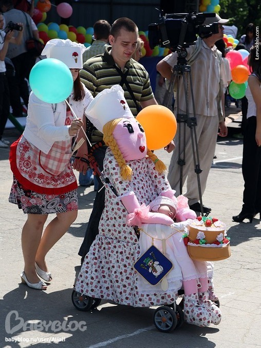 Это фото с парада колясок, проведенном в Волгограде в День защиты детей 2010 года, стало отправной точкой для моей идеи (прошу не считать ее плагиатом) наряда для нашего транспорта. И креативная семейка "рукодельников" с коляской -кондитером :)