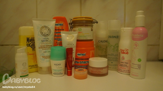 Каждый день я принимаю душ, по возможности протираю утром лицо кубиком льда, мажу лицо кремом, губы - бальзамчиком, каждый день после душа обязательно крем для тела и попу, ноги, растяжки - кремом антицеллюлитным и от растяжек, в душе стараюсь каждый день наносить скраб антицеллюлитный. Ну и крем для рук. Кремом для ног пока не обзавелась любимым, на сегодня эту функцию выполняет детский крем, который не понравился моему сынишке. Фотки средств ниже. Ну это кратенько, что я каждый день делаю...
