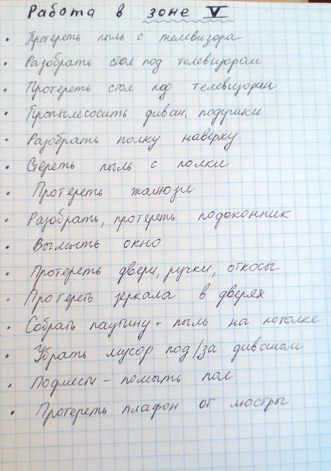 План работ в зоне 5: у меня гостиная крохотулька, наверно, метров 9-10 квадратных, поэтому план родился быстро, посколько особо там мебели нет, но все равно, почти на полный листик дел набралось: