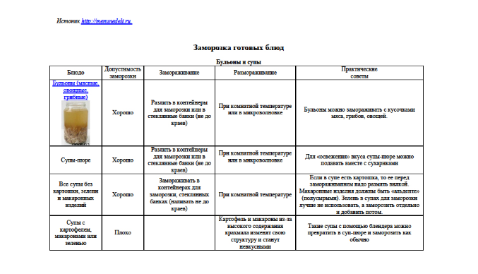 Предлагаю всем желающим (вышлю на мыло) табличку (доковский формат) с правилами замораживания, хранения и размораживания готовых блюд. Вот. к примеру, первая страничка таблицы. Пришлось перевести ее в формат рисунка - jpeg, т.к. доковский файл здесь не разместить.