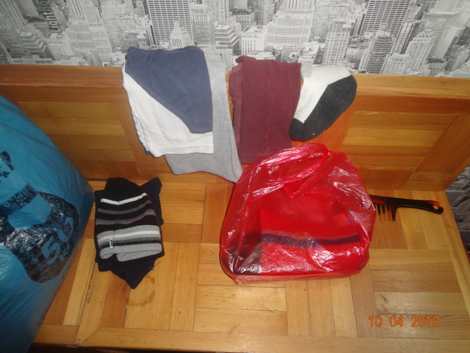 Сорри за опоздание, что-то у меня то свои какие-то хлопоты, то приболела. Короче, понятно, что причин как всегда дофига, но стараюсь выполнять все задания. Только вот на отчеты не хватает времени. Самое проблематичное задание. Поскольку я не работаю и регулярно почти никуда не выхожу, то пропадает весь смысл подготовки одежды «с вечера». Регулярно выхожу только в бассейн с ребенком и на разивашки, но это после обеда, соответственно, готовлю одежду и собираюсь, когда ребенок спит.На прогулки всегда есть джинсы и футболка, которые тоже готовить не надо, т.к. их много, всегда есть чистое)) Поэтому с вечера готовить ничего не буду, буду приводить в порядок в день по 1-2 вещи (глажка, ремонт, чистка).  С пятнами вещи стараюсь не допускать (стираю сразу). Чулки-носки разобрала, выкинула половину "потеряшек".