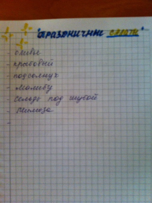 Салатики, которые готовлю для нас, не для гостей, всегда разные в зависимости, что есть и безымянные, но я вот так обозвала их, разделила по группам - с возможностью дополнения ингридиентов -