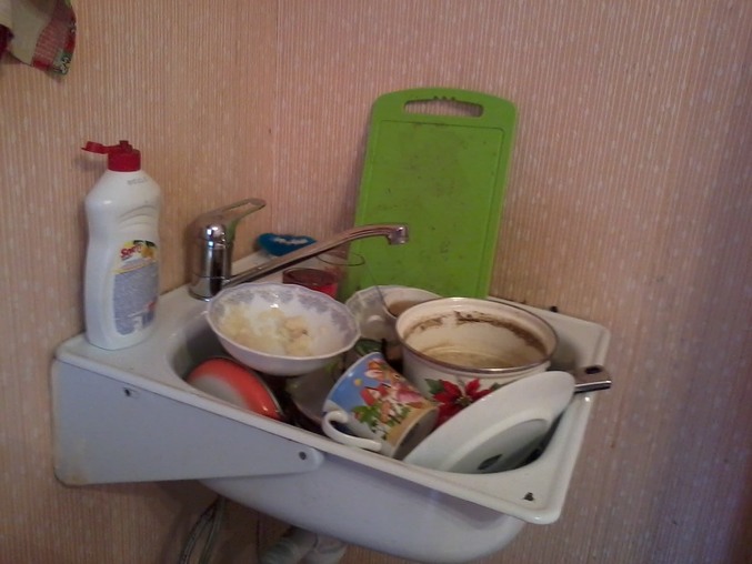 В раковину было некуда поставить,поэтому в кадр не попали сковородкИ, и несколько тарелок. Не стали туда подставлять,т.к. побоялись, что рухнет. А посуду которая не влазила он на разделочный стол горкой составлял, ведь ему только обеденный нужен был. В общем как чувствовал, что мне нужно капитально раковину отмыть. Молодец, помог!!! Помощник мой)))