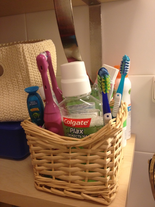 Готово! Ненавижу стаканчики для щеток, внутри которых скапливается всякая бяка - поэтому у нас корзинка, все проветривается. В ней храню ВСЕ - щетки, зубочистки, зубную нить, таймер(синий торчит, для детей), пасты(у нас их 3 флакона